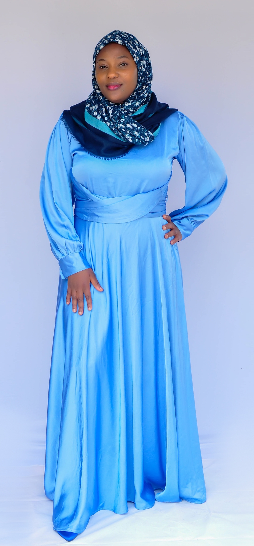 Introducing our Long Sleeve Satin Maxi Dress in blue- the perfect elevated wardrobe essential. Made with low- sheen satin, featuring elegant full length maxi dress with a wide sash for a perfect silhouette. This dress adds a touch of sophistication to your wardrobe. Embrace simplicity and elegance with our must-have piece.